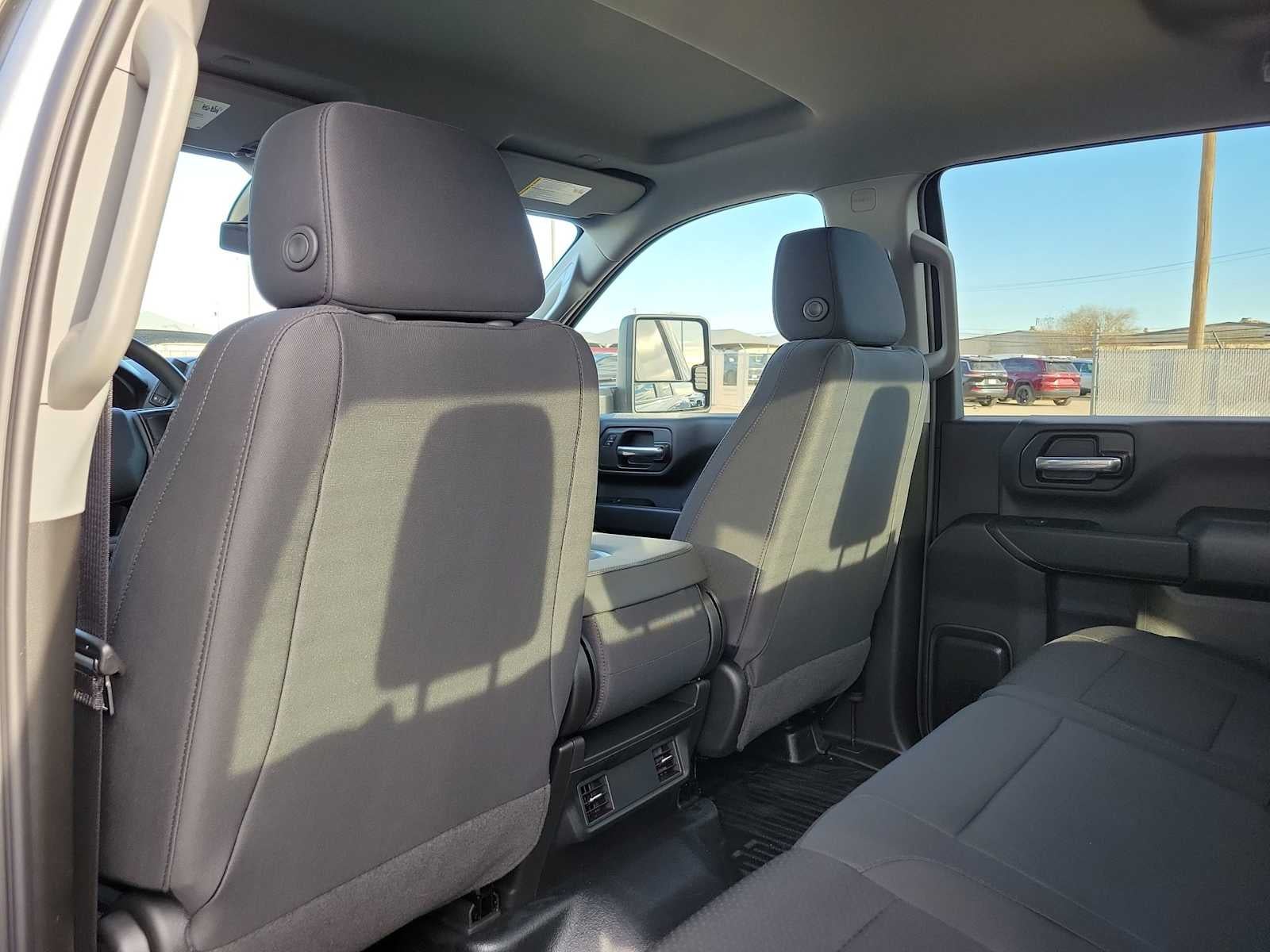 ENGINE, DURAMAX 6.6L TURBO-DIESEL V8, B20-DIESEL COMPATIBLE (470 hp [350.5 kW] @ 2800 rpm, 975 lb-ft of torque [1322 Nm] @ 1600 rpm), GOOSENECK / 5TH WHEEL PREP PACKAGE -- Hitch platform to accept Gooseneck or 5th Wheel hitch. Includes hitch platform with tray to accept ball, stamped bed holes with removable caps installed and bed mounted 7-pin trailer harness (similar to UY2 harness). (Includes (CGN) Chevytec spray-on bedliner. WT CONVENIENCE PACKAGE includes (QT5) EZ Lift power lock and release tailgate, (AKO) tinted windows, (C49) rear-window defogger, (DBG) power trailer mirrors with heated upper glass and manual extending/folding, MIRRORS, OUTSIDE POWER-ADJUSTABLE VERTICAL TRAILERING WITH HEATED UPPER GLASS lower convex mirrors, integrated turn signals, manual folding/extending (extends 3.31" [84.25mm]), GLASS, DEEP-TINTED, GVWR, 14,000 LBS. (6350 KG) WITH DUAL REAR WHEELS, AUDIO SYSTEM, CHEVROLET INFOTAINMENT 3 SYSTEM, 7" DIAGONAL HD COLOR TOUCHSCREEN, AM/FM STEREO Bluetooth® audio streaming for 2 active devices, voice command pass-through to phone, Wireless Apple CarPlay® and Wireless Android Auto® compatibility (STD), TRANSMISSION, 10-SPEED AUTOMATIC. Chevrolet Work Truck with Sterling Gray Metallic exterior and Jet Black interior features a 8 Cylinder Engine with 470 HP at 2800 RPM*.